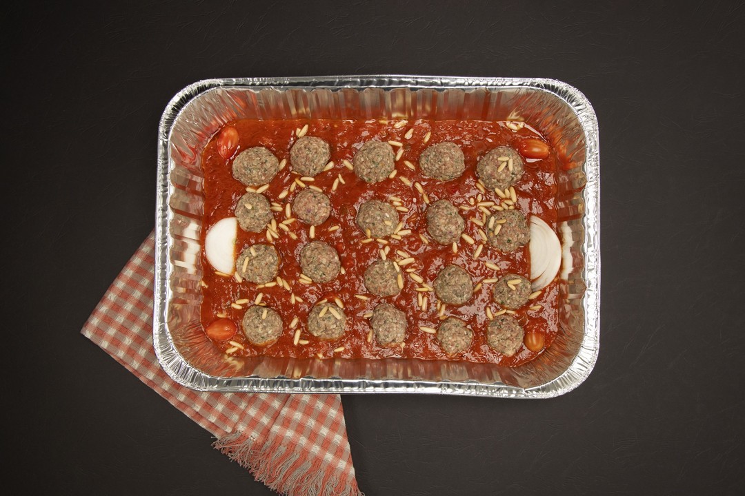 1 كيلو خليط لحم الغنم ولحم العجل مع الطماطم، البصل والصنوبر المتبلة بصلصة الطماطم جاهزة للطهي في الفرن لمدة 45 دقيقة. تكفي 4-5 أشخاص