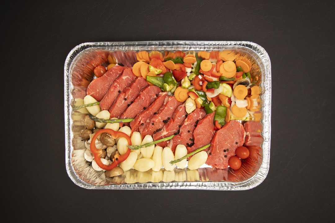 1 كيلو ستيك لحم بقري مبرد على طبقة من الخضار المشكلة (جزر، فطر، فلفل حلو، بطاطس، بصل) متبلة وجاهزة للطهي في الفرن لمدة 45 دقيقة
