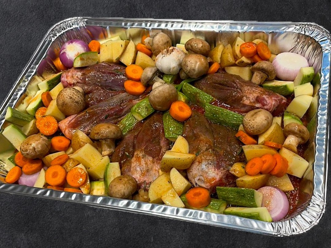 قطع لحم ضأن متبلة بصلصة العسل المميزة على طبقة من البطاطس والجزر ومزينة بالبقدونس. طهي لمدة 120 – 150 دقيقة