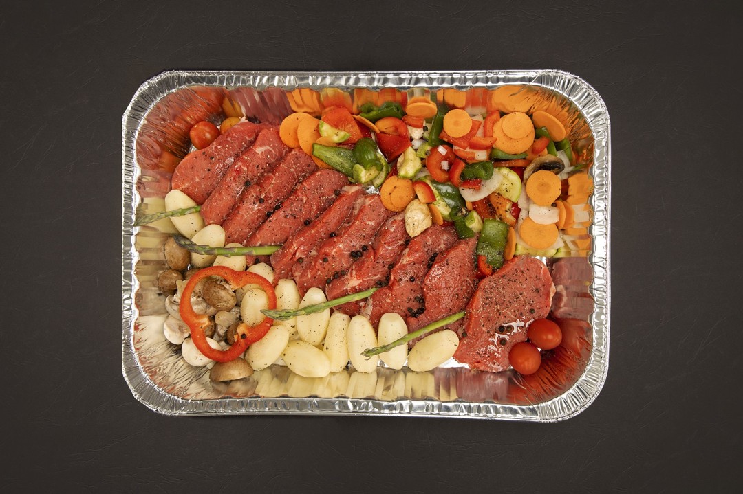 1 كيلو ستيك لحم بقري مبرد على طبقة من الخضار المشكلة (جزر، فطر، فلفل حلو، بطاطس، بصل) متبلة وجاهزة للطهي في الفرن لمدة 45 دقيقة